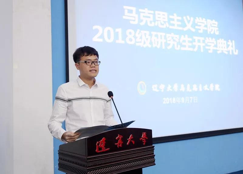 马克思主义学院导师代表王建老师、2016级硕士研究生代表邢馨月同学以及2018级新生代表赵志博、马克思主义学院党委书记、博士生导师房广顺教授分别做了发言。王建老师首先对2018级硕士新生的到来表示欢迎,并以大师哥的身份向大家介绍了自己在辽宁大学学习和工作的亲身经历。王建老师提出,要充分了解自己所在学科和所学专业,要做到自主转变,同时对同学们未来研究生的美好生活寄予期望和祝福。