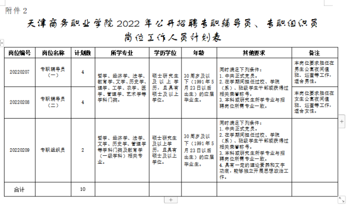 2.天津商务职业学院2022年公开招聘专职辅导员、专职组织员岗位工作人员计划表