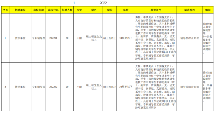我校2022年招聘专职辅导员40名,其中事业编制16名(按照综合成绩排序确定,其中男女各8名)、非事业编制24名(按照综合成绩排序确定,其中男女各12名)。