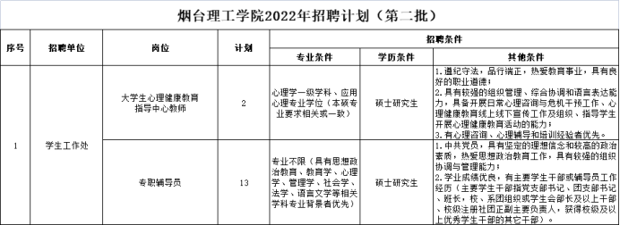 详见附件1:《烟台理工学院2022年专职辅导员、心理咨询教师岗位引进计划》