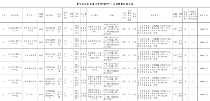 本次公开招聘共涉及6个岗位,拟公开招聘教师6名,具体岗位信息详见附件1《北京京北职业技术学院2022年公开招聘教师需求表》。